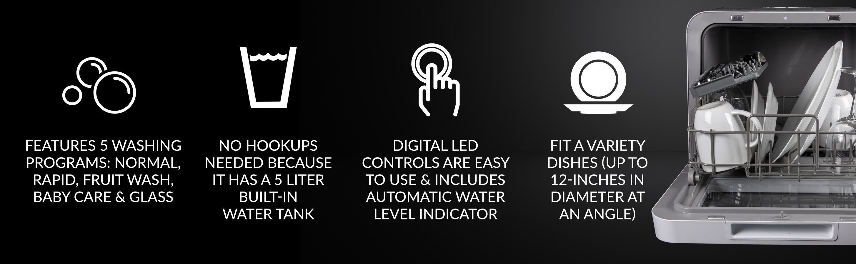 - FIVE WASHING PROGRAMS: You'll get full size dishwasher cleaning in a countertop sized compact unit that offers five wash programs - Normal, Rapid, Fruit Wash, Baby Care and Glass. Lower and upper spray arms give dishes that streak-free deep cleaning
