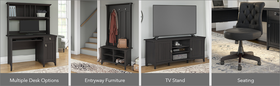 Feel comfortable in your home office with the casual styling of the Bush Furniture salinas collection. The versatile features of the Mission desk with hutch, lateral file cabinet and 5 shelf bookcase help you feel organized and keep your home looking great. Spread out on the desk surface while organizing cords in the cable management system. Store a keyboard or laptop on the pull-out shelf, and stash supplies in a box drawer and cabinet. Display photos, books and more in the open spaces of the hutch and in the 5 shelf bookcase, while you file your worries away in the 2 drawer cabinet. Attractive wood details, vertical accents, curved base rails and tapered legs create a casual look fit for a cottage, family home or apartment. Metal drop pull hardware complements the vintage black finish, which features a distressed touch to add a country feel to your space. Backed by a 1 year warranty.